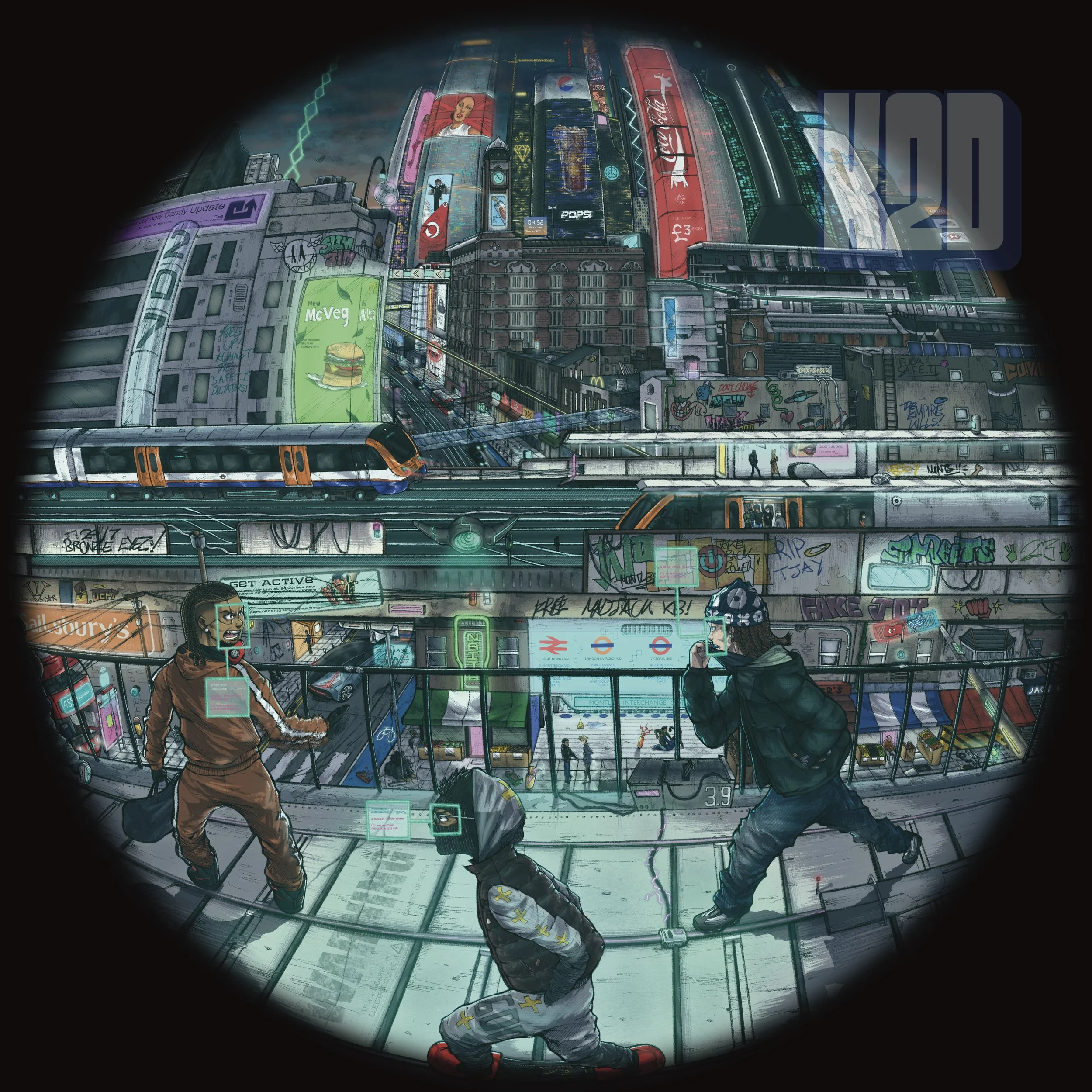 This was the first iteration of my detailed, future London city drawings. I tried mainly to combine London’s present with cyberpunk elements like holograms, skyscrapers, and neon lights. At this time, the world was still being developed, ideas and all. The fisheye perspective was also an experiment, meant to represent the POV of a survey drone.