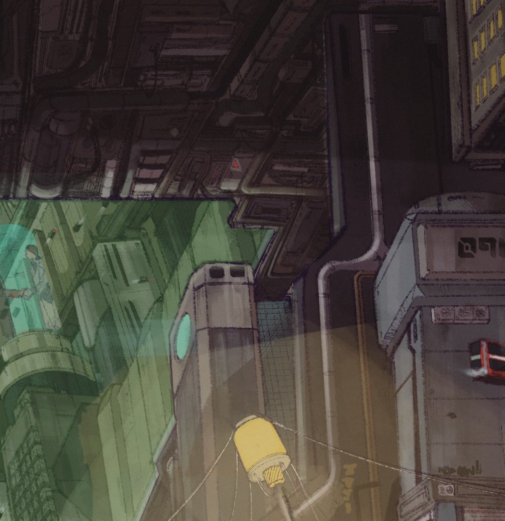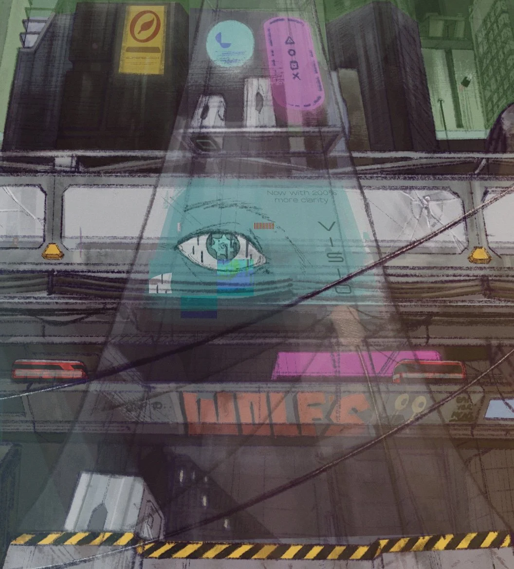 This piece is my most recent, and is currently the most fleshed-out visual of the cyberpunk London world I've been crafting. London of the future is a layered city, with each Tier based on the citizen’s quality of Life. This piece shows three youths approaching a “Tier Gate” in the centre of their area, the fictional borough of Montley (N23). With this drawing, I wanted to show everything about the bottom and worst layer future London has to offer. As such, many references to slightly older work regarding my London “world”.